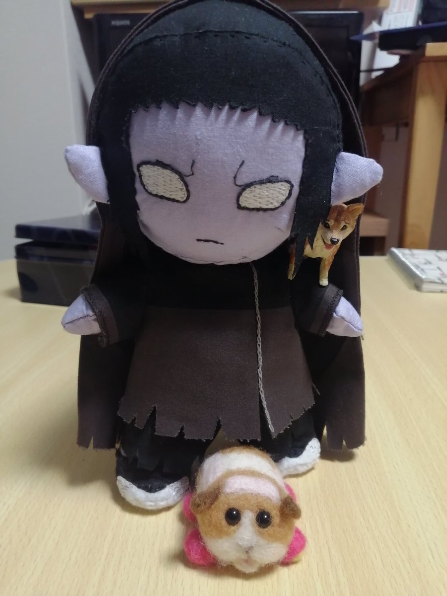 ナギリさんぬい 完成した姿も載せておきます 平栗あずさ著「きせかえできるぬいぐるみ てづくり推しぬいBOOK」の型紙(大)使用。エルフ耳を大きく、顔の輪郭を細めに調整しています 生地はシーチングに接着芯を貼ったものを使っています 血の刃も着脱可能 骨はトイスケルトンです