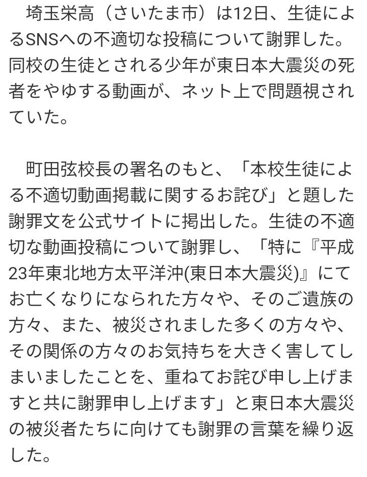 埼玉栄高 phi72110 2023年3月12日 in TVニューストレンド Tagged トレンド, ニュース - 0 Minutes 985 total views, 2 views today youkai-watch@youkaiwatch2014 フォローする 埼玉栄高が不適切動画を謝罪 生徒が投稿 東日本大震災の被災者、遺族らに「お詫び申し上げます」 返信 リツイート いいね 2023年03月12日 05:29:05 Related posts:ヌートバーさんユンジョンウ電撃ホビー