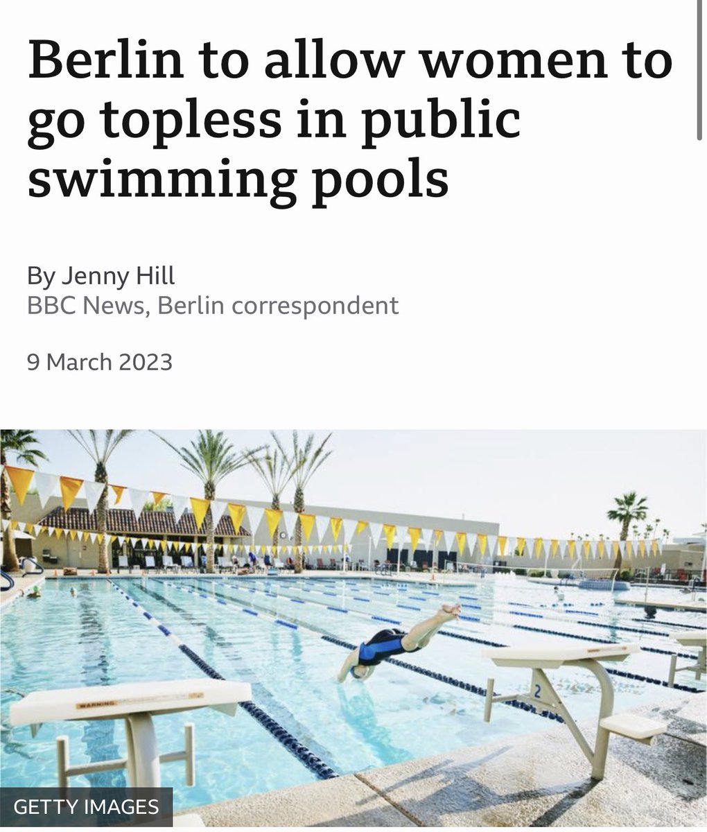 德国柏林3月9日宣布,今后女性也能和男性一样,在柏林的公共室内及室外游泳池裸上身游泳, 未来公共泳池必须以 性别平等的方式实施其使用规则。 这个规则好!这是要发展旅游业!我支持!